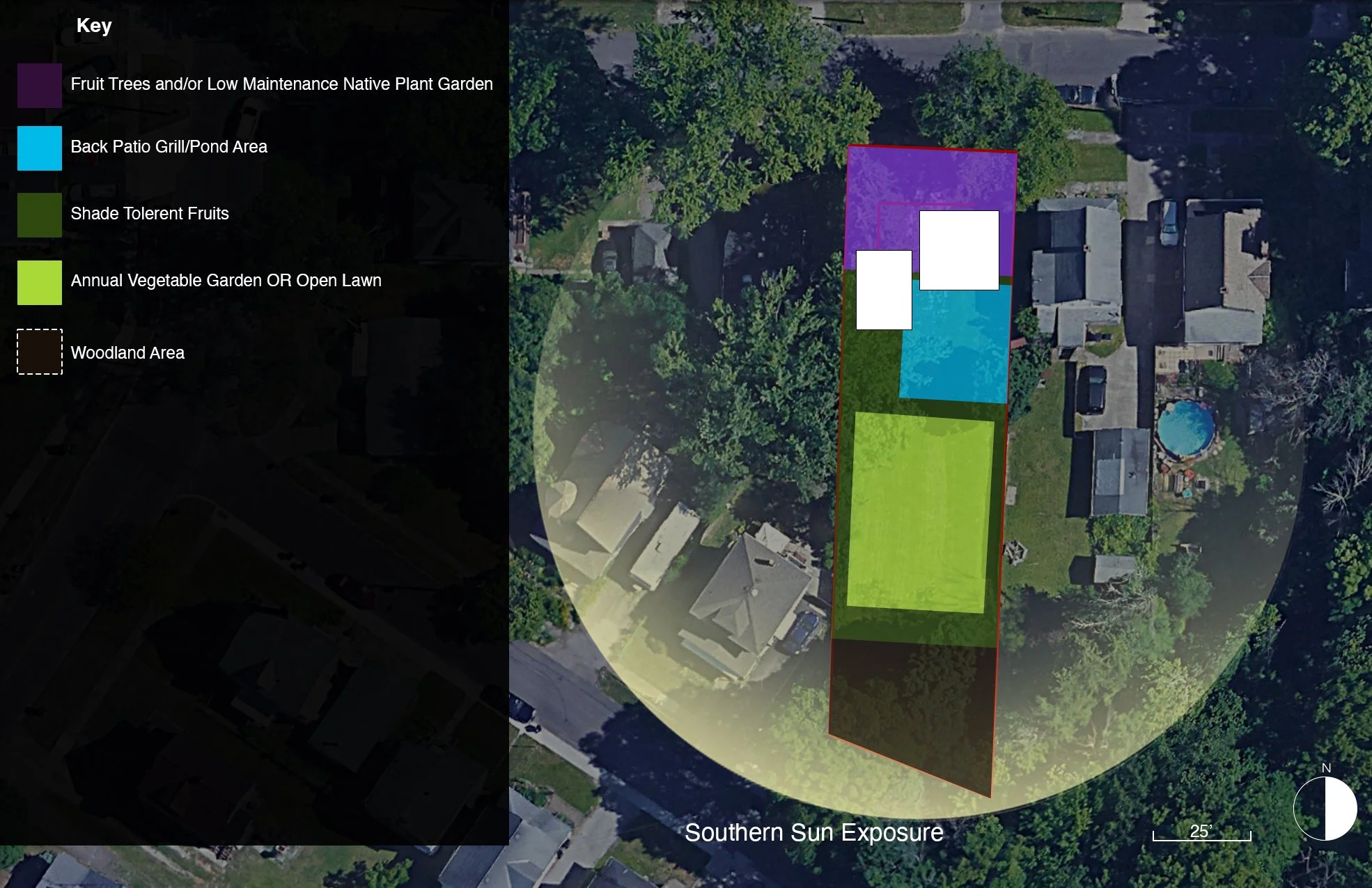 This is the Design Base Map, or initial Schematic Map for the landscaping of a new house construction. The property is analyzed and blocked into generalized areas, creating a base map for the development of the design. The blocks are designed based on strengths and potential seen on the property. For example, areas that receive abundant heat and sunlight support some plants better than others, just as areas that are in the shade of existing buildings are best for other plants or features.